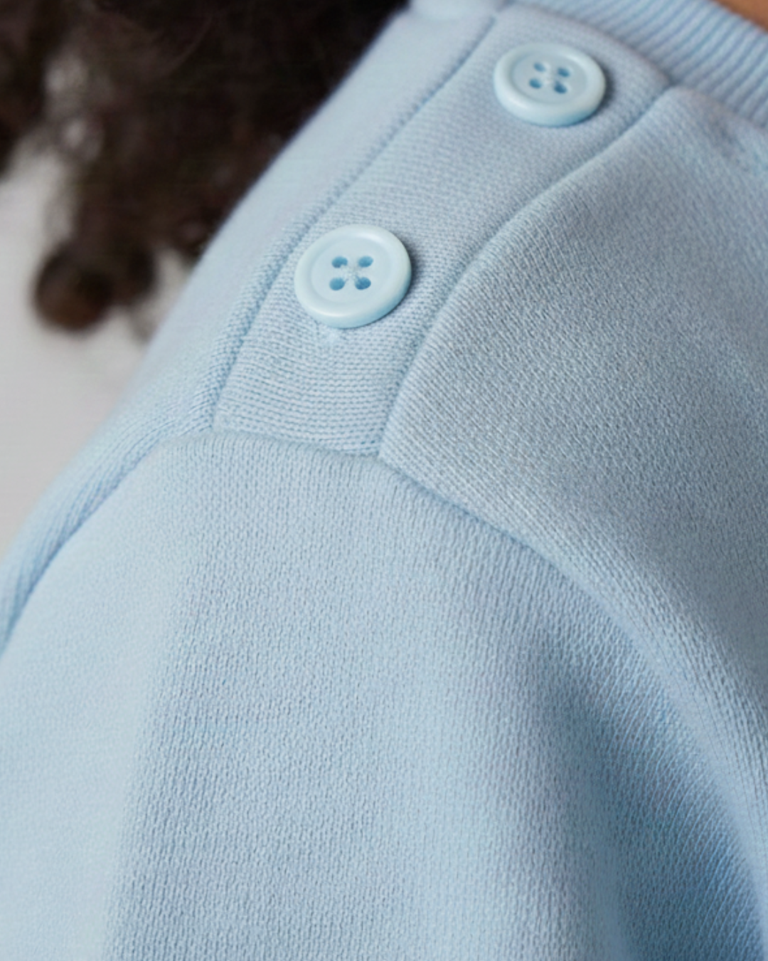 A closed neckline supports gentle coverage and daylong comfort. Side buttons appear on smaller sizes to support easy dressing without pressure or irritation.